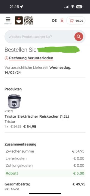 Saya pun segera mendaftar ke situs dan mengambil kupon promo potongan 5€ jika berlangganan ke newsletter mereka, lalu membeli dan menerapkan kupon, sehingga harga yang saya dapat menjadi 49,95€ bebas ongkos kirim.